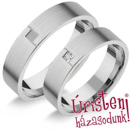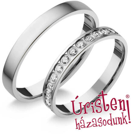 Vékony, 3 mm széles, fehér arany karikagyűrű, fényes felülettel. A női gyűrű cirkónia kövekkel körbe kövezett.