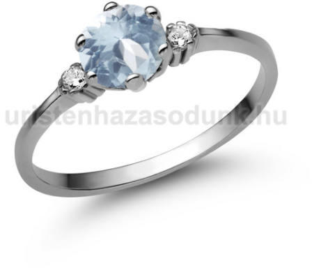 Nagy köves fehér arany eljegyzési gyűrű, 5.5 mm-es akvamarin kővel középen és 2 kisebb cirkónia kővel oldalt.