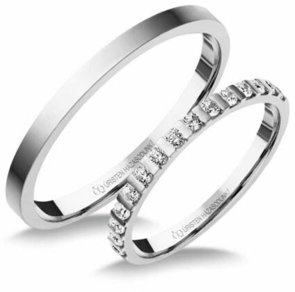 Vékony, 1.9 mm-es, klasszikus, fehér arany karikagyűrű, fényes felülettel. A női gyűrű gyémánt kövekkel ékített.