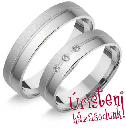 Vékony, 3 mm széles, fehér arany karikagyűrű, körbe vésett, fényes és matt felülettel. A női gyűrűt 1 gyémánt kő ékíti.
