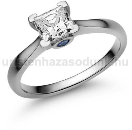 Fehér arany eljegyzési gyűrű nagy, szögletes, kék zafír kővel, a foglalatban különleges, szív alakú kővel.