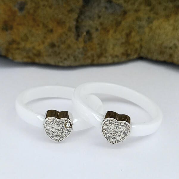 Fehér kerámia gyűrű, melyet szív alakú nemesacél alapon elhelyezett fehér cirkónia kristályok tesznek csillogóvá. A kristályok karmos foglalatban helyezkednek el. Szép csillogását a polírozásnak köszönheti. Nem törékeny, bátran viselhető akár mindennapi viseletként is. A kerámia teljes egészében fehér színű, nem felületi festése van, folyamatos viselet mellett sem