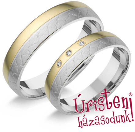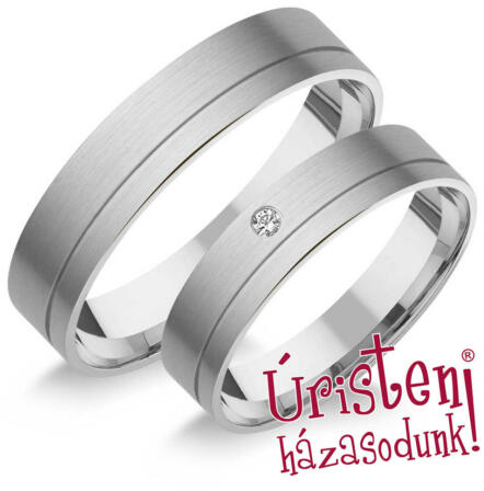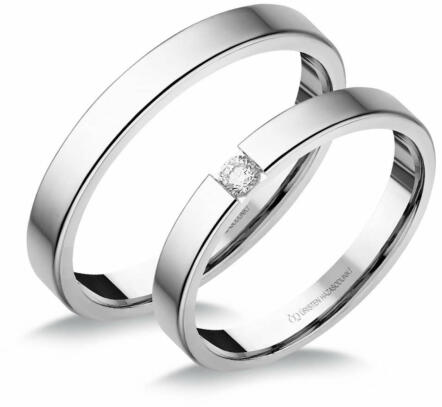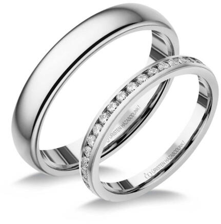 Klasszikus, fehér arany karikagyűrű, domború profillal. A női gyűrű gyémánt kövekkel ékítve.