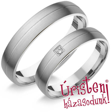 Fehér arany karikagyűrű, középen vésett, matt és fényes felülettel. A női gyűrű cirkónia kővel díszített.