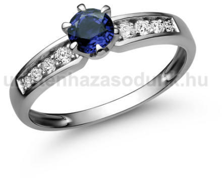 Exkluzív stílusú eljegyzési gyűrű, modern csiszolású kék zafír kővel, mellette 4-4 darab cirkónia kővel.