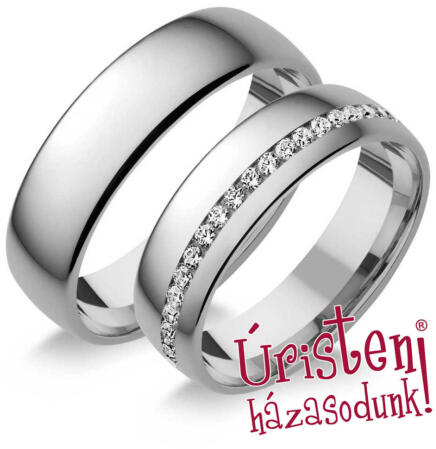 Modern, fehér arany karikagyűrű, 6 mm széles sínnel, enyhén domború külső és belső profillal. A női gyűrű 21 cirkónia kővel díszített.