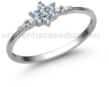 Modern női gyűrű 7 akvamarin kővel virág formát alkotva és 2-2 cirkónia kővel oldalt.