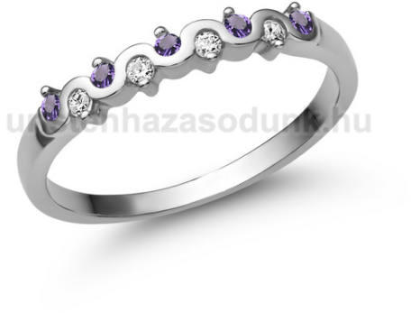 Hullámos fehér arany eljegyzési gyűrű ametiszt és gyémánt kövekkel.