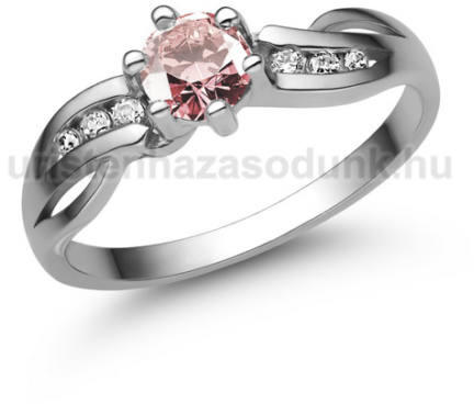 Fehér arany eljegyzési gyűrű 4.5 mm-es rózsaszín zafír kővel, karmos foglalatban és további 6 gyémánt kővel oldalt.