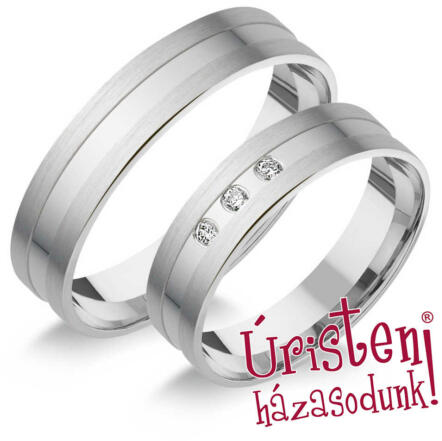 Modern, fehér arany karikagyűrű, lapos külső profillal és enyhén domború belső profillal. A női gyűrű 3 gyémánt kővel ékített.