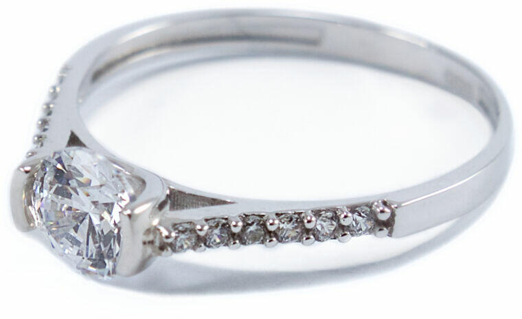 Modern kialakítású, cirkónia kövekkel és ródium bevonattal díszített női fehérarany gyűrű.