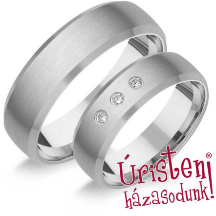 Modern, fehér arany karikagyűrű, trapéz külső profillal, kényelmes, dmború belső profillal. A női gyűrű 3 gyémánt kővel ékített.