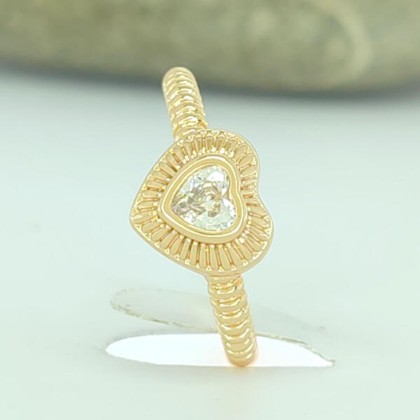 Aranyszínű gyűrű csillogó fehér cirkónia kristály és szív motívum díszítéssel. A kristály ragaszott, peremezett foglalatban helyezkedik el. Időtálló darab, nem feketedik víz hatására sem. Szív minta mérete: 8,5 mm x 10 mm. Antiallergén ékszer. 18K arany színben kapható. Az antiallergén ékszerek olyan fémötvözetből készülnek, melyek nem irritálják a bőrt, nem o