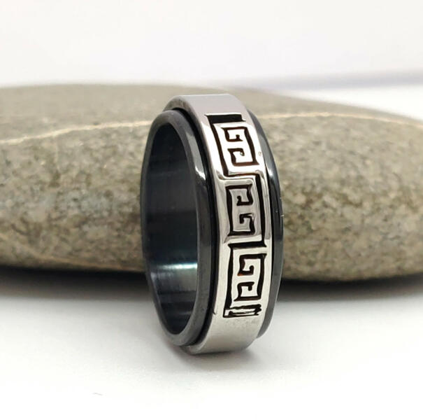 Fekeke-ezüstszínű nemesacél (316L) dupla gyűrű, melyet áttört görög minta díszít. A két karika forgatható egymáson. Minőségi anyagának köszönhetően mindennapi használatra is alkalmas. Gyűrű szélessége: 8 mm. Antiallergén ékszer. A nemesacél ékszerek rendkívül népszerűek kedvező tulajdonságaik miatt. A nemesacél semmilyen nikkelsót nem bocsájt ki magából, en