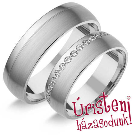 Matt és fényes felületű, fehér arany karikagyűrű. Széles, 6 mm-es sínnel, a női gyűrű 16 cirkónia kővel díszítve.