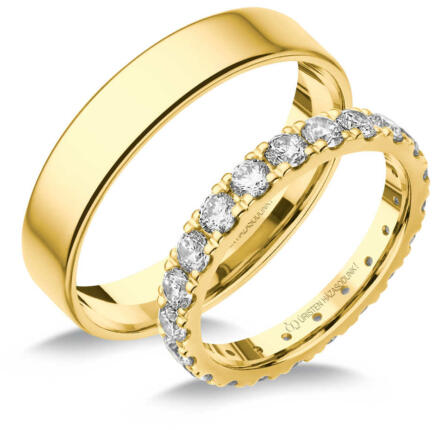 Hullámos véséssel díszített, sárga arany karikagyűrű, matt felülettel, enyhén domború külső-belső profillal. A női gyűrűt 5 gyémánt kő ékíti.