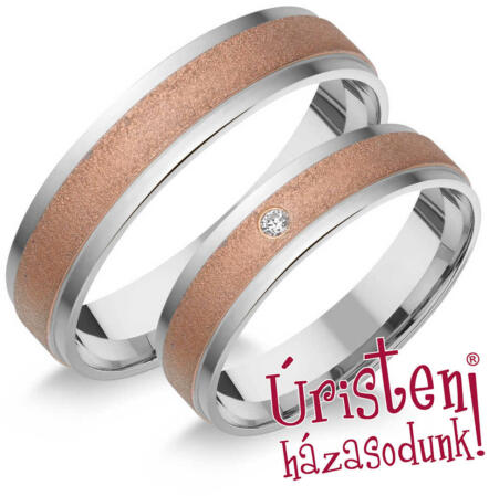 Többszínű, aranyból készült jegygyűrűk, enyhén lekerekített profillal. Ezek a 4 mm széles karikagyűrűk belső lekerekített profillal rendelkeznek a nagyobb kényelem érdekében. A gyűrűk központi dísze egy vonal, amely a karikagyűrűket kétfelé osztja, sárga és fehér aranyban, finom átlós dombornyomással, középen egy csodálatos, tündöklő cirkonnal díszítve. Amen