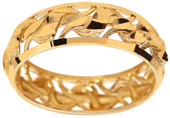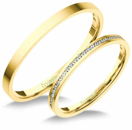 Cirkónia kövekkel díszített, hagyományos, sárga arany karikagyűrű. Vékony, 1.8 mm-es sínnel, lapos külső profillal.