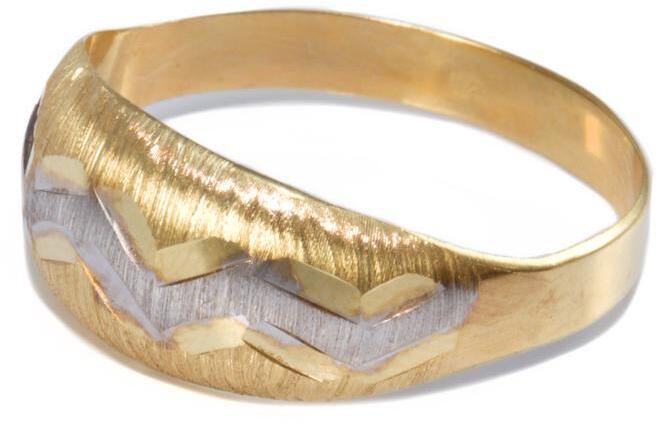 Modern stílusú, ródiummal, véséssel és mattítással ékített, domború kialakítású, üreges arany gyűrű.