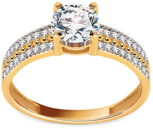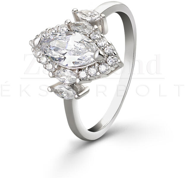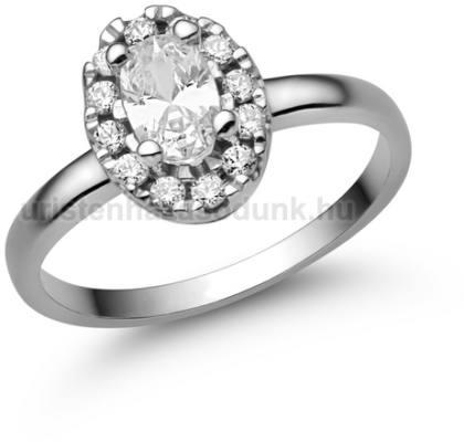 Különleges, nagy köves eljegyzési gyűrű, 6 mm átmérőjű ovális cirkónia kővel és 12 kisebb cirkónia kővel oldalt.