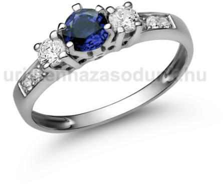 Különleges, exkluzív megjelenésű eljegyzési gyűrű 1 darab kék zafír kővel és 4-4 darab cirkónia kővel oldalt.