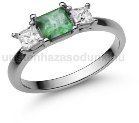 Sikkes eljegyzési gyűrű, nagy, princess (szögletes) csiszolású smaragd kővel és 2 darab princess csiszolású gyémánt kővel.