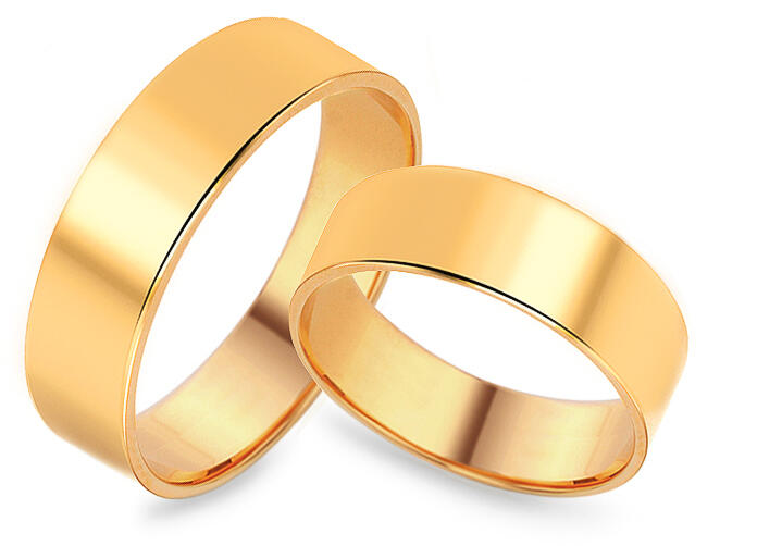 Sárga, tizennégy karátos aranyból készült jegygyűrűk, lapos profillal, melyeknek szélessége 6 mm. A karikagyűrűk felülete sima és magasfokú polírozással kezelt. Ennek köszönhetően tökéletesen kiemelkedik az arany szépsége. A jegygyűrűk méretét külön-külön választhatja ki - a női és a férfi gyűrűjét egyaránt. Amennyiben be szeretné gravíroztatni az esküvő