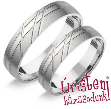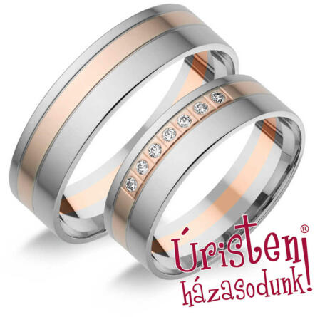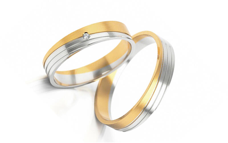 Ez a két jegygyűrű finom és elegáns hatást kelt, kombinált, aranyból készültek, lapos külső profillal. Ezek az 5 mm széles karikagyűrűk belső lekerekített profillal rendelkeznek a nagyobb kényelem érdekében. A központi díszt átlós vonalak alkotják, amelyek áthaladnak a gyűrűn, ahol az egyikük a gyűrűket kétfelé osztja, az egyik felük sárga, a másik fehér arany,