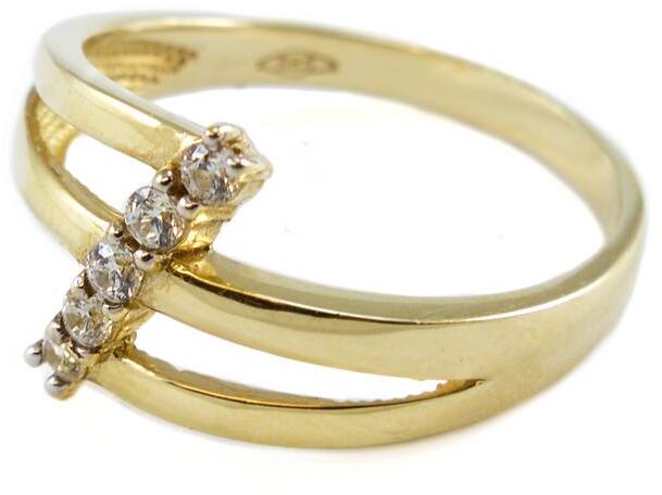 Modern fazonú, sín részén átlós elhelyezkedésben öt darab cirkónia kővel ékített, sárga arany gyűrű.