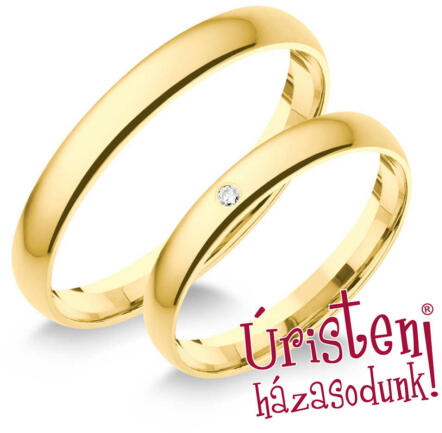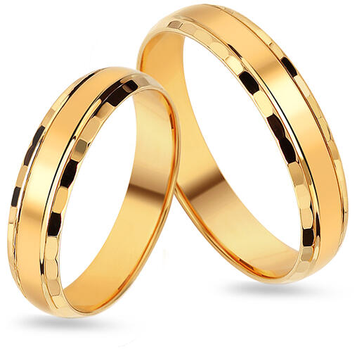 A sárga aranyból készült jegygyűrűk szélessége 4,5 mm. Belső profiljuk lapos, míg külső félkör alakú. Mindkét gyűrű széleit csillogó textúrájú minta díszíti. Az esküvő dátumának vagy a névnek karikákba gravírozása csak INGYENES. Az arany szépsége kiemelkedik a magas fényezésnek köszönhetően.