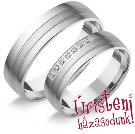 Fényes és matt felületű fehér arany karikagyűrű, véséssel. A női gyűrű 7 gyémánt kővel ékített.