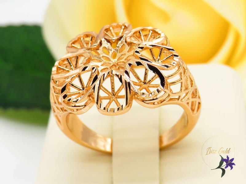 Goldfilled virág alakú gyűrű csipke mintázattal Szin: 18 K Méret: 20x20x3 mm A forgalmazott divatékszerek alapanyaga nikkel és ólommentes ezért többnyire nem okoznak allergiás tüneteket, nyugodtan hordhatják fémérzékeny emberek is. Általában nem színezik a bőrt és más divatékszerekhez képest nagyságrendekkel jobb kopásállósággal rendelkeznek. A fehér (ezüst) színű