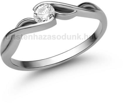 Csavart stílusú, fehér arany eljegyzési gyűrű, fehér zafír kővel.
