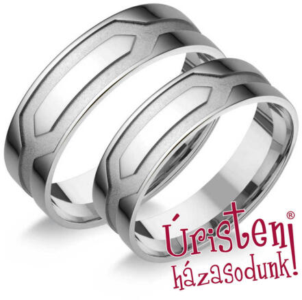 Széles, fehér arany karikagyűrű, matt felülettel, középen fényes felülettel. A női gyűrű 3 gyémánt kővel ékített.