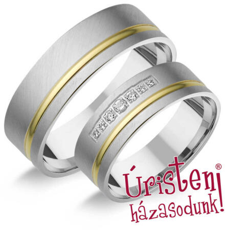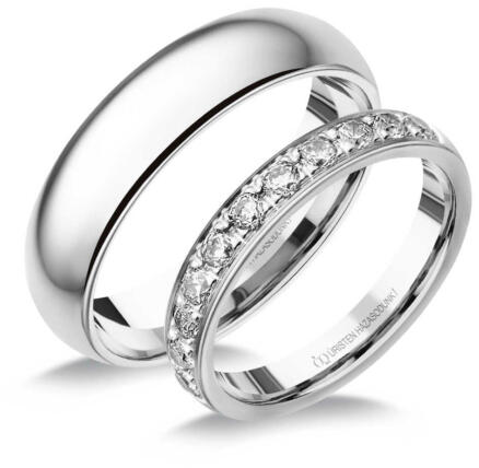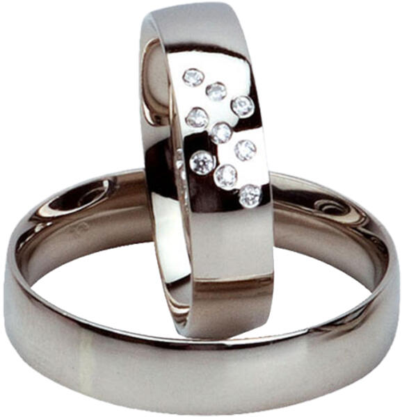 Széles, klasszikus, fehér arany karikagyűrű, fényes felülettel. Kívül-belül domború, kényelmes viselet. A női gyűrű cirkónia kövekkel díszítve.
