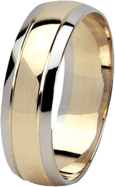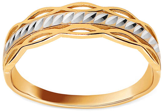 Modern, 14 karátos kombinált aranyból készült gyűrű, amelyet minden hölgy értékelni fog. A gyűrű középső karikájának felületkezelése a kétszínű hatást biztosító ródium bevonat és a gravírozás kombinációjából áll, amelyet mindkét oldalán egybefonódó minta díszít. Ajándékba ajánljuk.