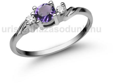 Csavart fazonú eljegyzési gyűrű ametiszt kővel középen és 1-1 gyémánt kővel oldalt.