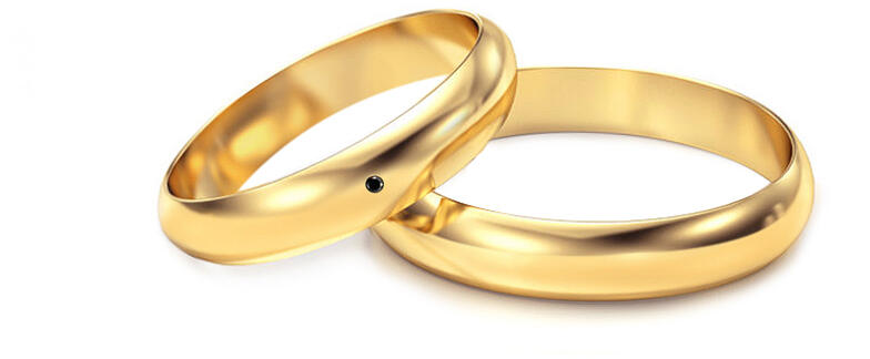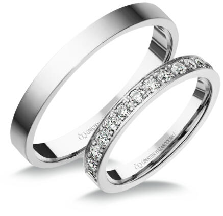 Fehér arany, klasszikus karikagyűrű. 2.8 mm széles sínnel, fényes felülettel, a női gyűrű gyémánt kövekkel ékítve.