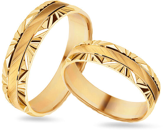 Sárga, tizennégy karátos aranyból készült jegygyűrűk lapos profillal. A gyűrűk dísze egy középső vonal vonzó, átlós dombornyomással, amely érdekes tündöklő, változékony hatást kelt. A peremvonalakat gyönyörű gravírozott minta díszíti, magasfokú polírozással. Ezek az 5 mm széles karikagyűrűk belső lekerekített profillal rendelkeznek a nagyobb kényelem érdek