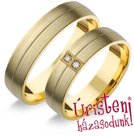 Modern, matt felületű, sárga arany karikagyűrű, véséssel. A női gyűrűt 2 kerek formájú gyémánt kő ékíti, szögletes foglalatban.
