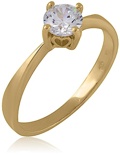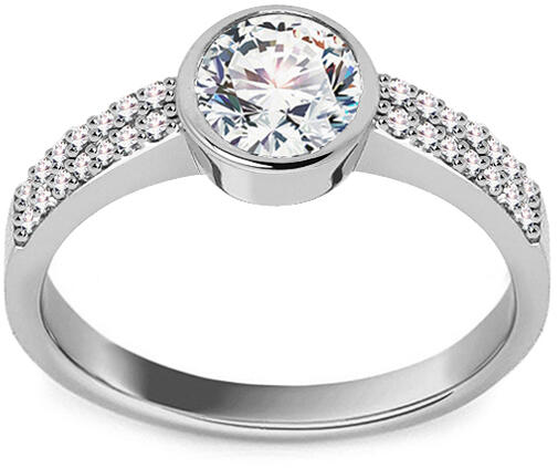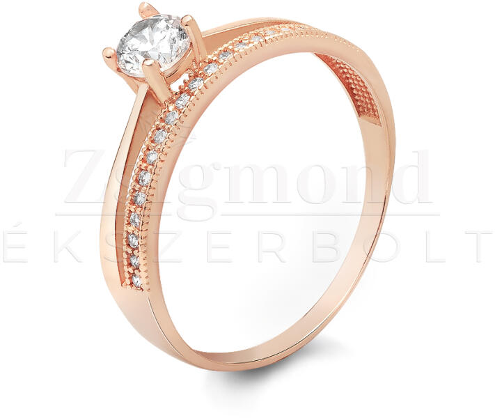 Ragyogó eljegyzési gyűrű, amelynek jellegzetes koronáját egy sima arany szegéllyel rendelkező ragyogó cirkónia díszíti, amelyet a gyűrű oldalán kisebb cirkóniák csillogása egészít ki.