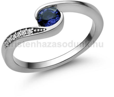 Modern, csavart stílusú fehér arany eljegyzési gyűrű kék zafír kővel és gyémánt kövekkel.