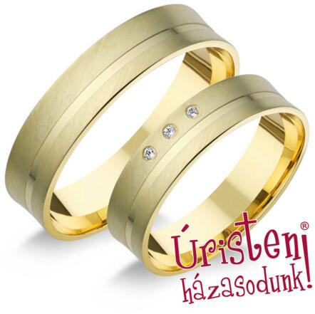 Széles, sárga arany karikagyűrű, matt felülettel és fényes véséssel. A női gyűrű 3 gyémánt kővel ékített.