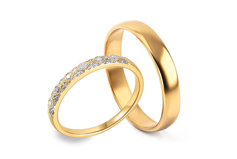Hagyományos, rozé arany karikagyűrű, fényes felülettel, kívül-belül domorú profillal. A női gyűrű cirkónia kövekkel díszített.