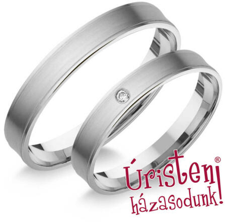 Vékony, matt és fényes felületű, fehér arany karikagyűrű. A női gyűrű gyémánt kővel ékített.