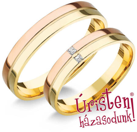 Rozé és sárga arany karikagyűrű, letisztult fomavilággal, a női gyűrű 2 cirkónia kővel díszítve.
