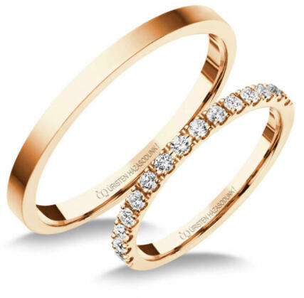 Vékony, klasszikus karikagyűrű, rozé aranyból készítve. A női gyűrű gyémánt kövekkel ékítve.