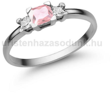 Modern, 3 köves eljegyzési gyűrű, szögletes rózsaszín zafír kővel és 1-1 cirkónia kővel odlalt.