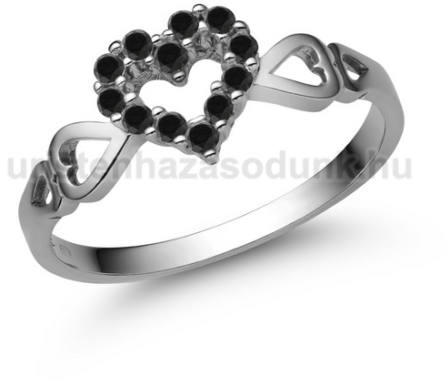 Modern formavilágú eljegyzési gyűrű, 7 darab briliáns csiszolású fekete gyémánt kővel és 6 darab gyémánt kővel.