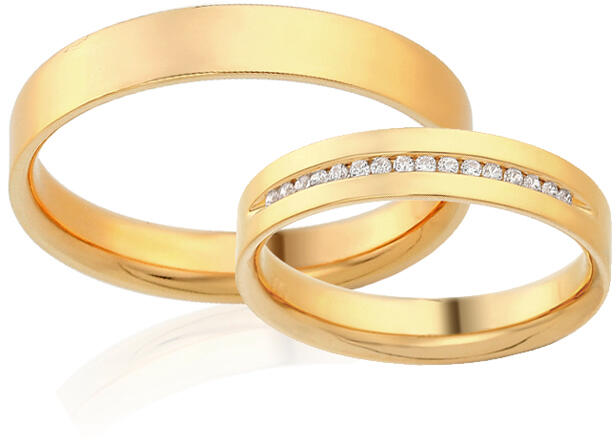 Modern, sárga arany karikagyűrű, fényes és matt felülettel, lapos külső profillal és enyhén domború belső profillal. A női gyűrűt 1 gyémánt kő ékíti, szögletes foglalatban.